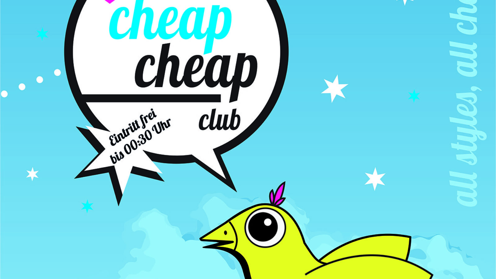 Einen besseren Start ins Wochenende gibt es nicht! Feiert im Cheap Cheap Club den Start ins Wochenende und zwitschert ordentlich vor, mit allen Getränken zum halben Preis und freiem Eintritt bis 00:30 Uhr! Auch danach geht’s bis in die frühen Morgenstunden weiter, mit Becks für 2,80 € und Caramel-Vodka für 1,50 €. Dazu versorgen euch unsere Residents mit den heißesten Beats & Sounds – frei nach dem Motto: all styles, all charts! Cheapt mit uns auf dem großen Floor mit fetter Lichtshow, Tanzpodesten, Tischkicker und jeder Menge guter Drinks in ein erfolgreiches Partywochenende!